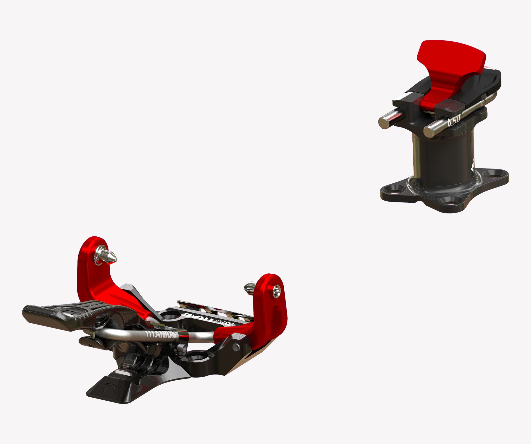 One simple component in titanium specially designed in its shape and structure links the two jaws in the toe unit. This extremely simple mechanism offers a significant guarantee of functionality and reliability. The toe unit jaws open with a light pressure on the front lever, which can be pressed either by hand or with a ski pole. Position the boot so that the jaw pins are level with the holes on the side of the boot, then release the lever so the jaws close locking the toe of the boot into place. Rotate the lever upwards to block the opening of the jaws. This special elastic component in titanium permits the toe unit to adapt perfectly to all types of boots, guarantees that the boot remains fixed in place and with the help of some particularly well finished and crafted pins it can clean out the boot inserts during use.